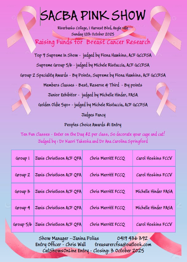 *SAVE THE DATE* SA Cat Breeders PINK Show - Sunday 12th October - see SHOW CALENDAR