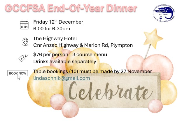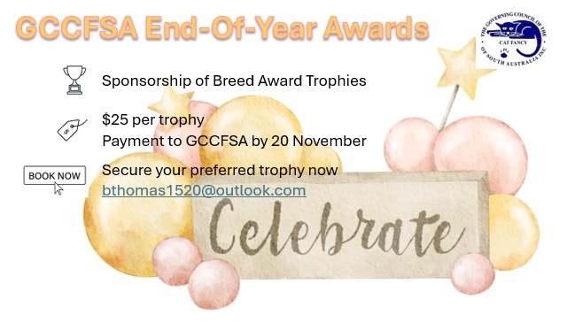 Established in 1962 and affiliated with the Australian Cat Federation, the Governing Council of the Cat Fancy of South Australia (GCCFSA) is the original controlling body and pedigreed cat registry in this state. The Council is supported by affiliated cat clubs, and we cater for all cat-lovers / owners / breeders of most cat breeds.